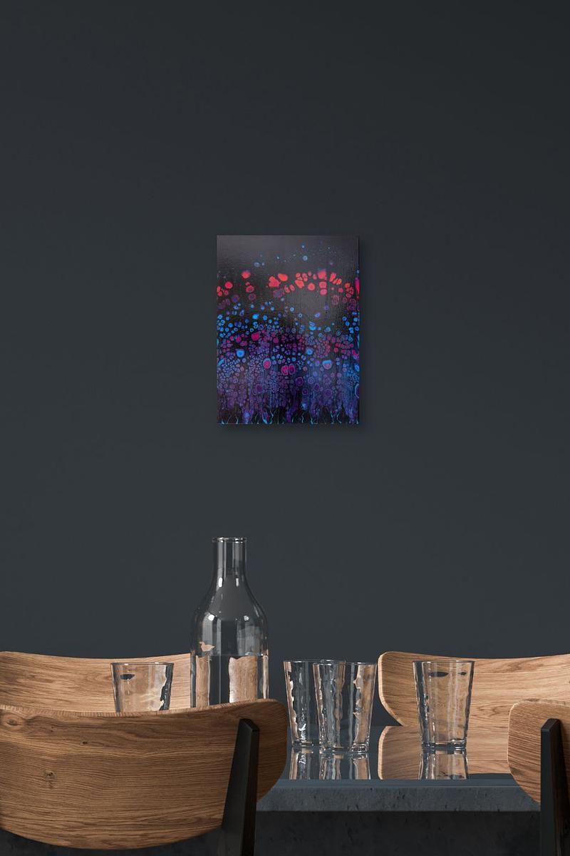 Die Acrylfarben sind mit hochglänzendem Firnis versiegelt und das Bild ist rückseitig signiert.