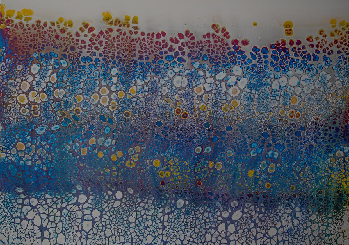 Mit weißer Farbgrundlage und einer ziemlich bunten Mischung entstand ein Pouring, das den Eindruck einer schier unendlichen Zellen Unterwasserlandschaft vermittelt.